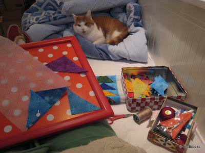 Op de foto zie je een quiltje dat ik nog niet eerder liet zien, en nu is het nog een slecht beeld ook (ik beloof beterschap). Dit is een klein quiltje (70x90 cm) dat ik een tijd geleden begon met rozenstofjes (alle drie) en het Puss in the corner blokpatroon. Het quiltje maak ik voor Roos mijn poes en ik ga het 'Rose in the corner' noemen. Het lag al een hele tijd onafgemaakt in een zakje klaar met alle benodigdheden bij elkaar en ik kwam het laatst weer eens tegen in mijn UFO's kast. Ik moest er slechts nog de 4 randen met hoekblokjes aan vastnaaien (waarom was dat niet al gedáán?) (ik denk omdat ik het middenstuk nodig moest persen, met alle naadjes de goede kant op enzo). Dat is nu eindelijk gedaan en ik heb het meteen gedubbeld. Nu nog even bedenken hoe ik het wil quilten..... Ik zit te denken diagonale lijnen door het midden van alle blokjes met rood garen (en de machine?) en dan met de hand en wit garen hartjes in alle lege blokjes, een kabeltje in de randjes en klaar (een 5 jarenplan wellicht). Wordt vervolgd!