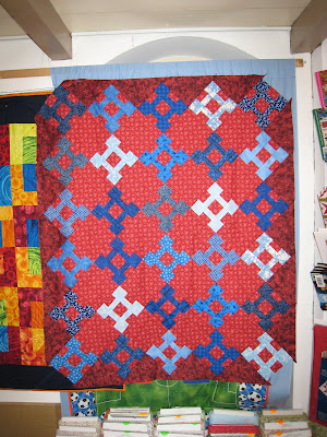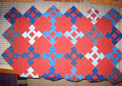 Hij lag te wachten op een geschikte stof voor de rand-driehoeken. Maar ik kon steeds de juiste niet vinden. Ik had het al geprobeerd met een donkerrode, en dezelfde stof als de blokjes vond ik te saai: