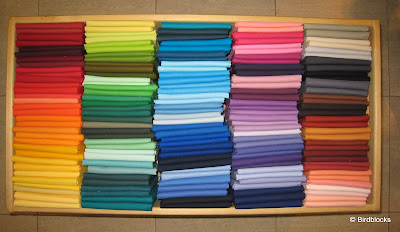 Vandaag laat ik de eerste kist zien die klaar is. Dit is altijd de makkelijkste, want effen stoffen hebben we altijd mee, en die hoeft dus 'slechts' aangevuld te worden, wat is eruit en welke nieuwe kleuren effen zijn er binnengekomen. Ook maken we altijd nog een bak voor onder de toonbank, zodat we gedurende de beursdag of gedurende de beurs nog kunnen aanvullen. Op die manier hopen we de mensen die op de zondag komen het zelfde aanbod te kunnen doen als de mensen die op de eerste dag komen! Helaas betekent dat natuurlijk wel voor ons dat we 'veel te veel' mee heen en weer slepen, maar dat heb ik er graag voorover.