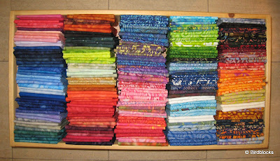 Kijk, er zit net zo'n heerlijk kleurverloop in als in mijn restjesproject. Je weet wel, de flying geese stroken van de maandag-updates (zoek maar op in de rechterkolom bij de labels: Flying geese update). Ja, ja, die gansjes zijn allemaal gemaakt van restjes, de achtergrondstof en de tussenbanen (die heb ik nog niet laten zien, is nog niet in gebruik genomen) natuurlijk niet, aangezien ik die delen wel van één stof heb gemaakt.