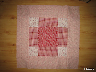 Hier het plaatje van het (nu nog wat saaie) middenblok. Dat komt omdat ik de applicaties er pas op ga maken als alles in elkaar zit. Zoals je ziet heb ik heel andere kleuren gekozen dan in de ontwerpschetsen. Ik ga mijn sampler maken in rood/roze/wit. Het wordt een scrappy geheel met veel verschillende stofjes.