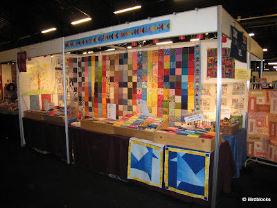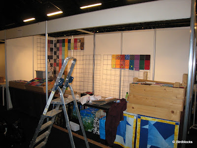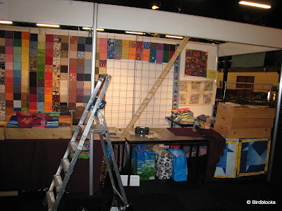 De rekken met lapjes zijn half leeg (Sommeke, naar aanleiding van je vraag van eergisteren: De lapjes hangen dus op metalen frames hè, zo kan ik gemakkelijk laten zien wat we allemaal mee hebben, ik moet er toch niet aan denken om voor elke beurs een nieuw paneel van 4x2,5 meter te moeten naaien). Je ziet dat de bovenste twee rijen blijven hangen, daar kan ik vanaf de grond niet goed bij.