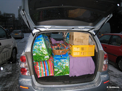De auto is bijna vol, er moesten nog 3 tassen bij (en dat ging, want ik kan best een auto goed inpakken, al zeg ik het zelf) en de stand is leeg! (even tussen twee haakjes: zien jullie de sneeuw? Het sneeuwde tijdens het inladen :-( )