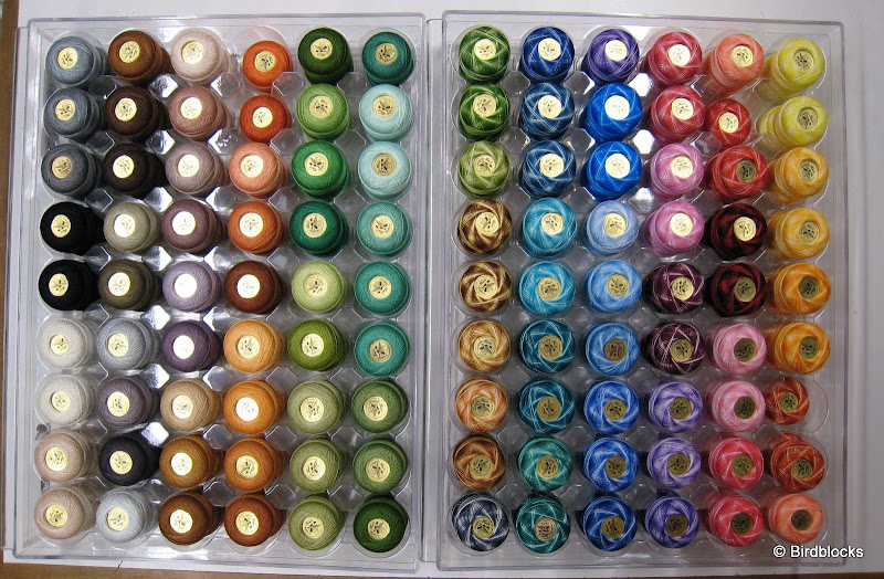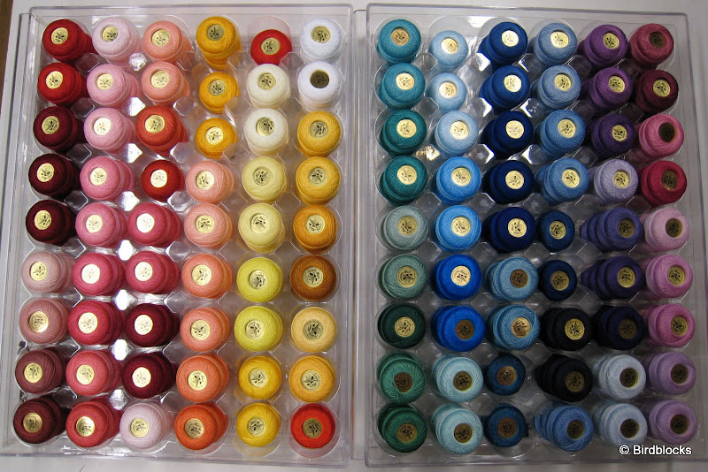 Voor garen geldt hoe hoger het nummer hoe dunner het garen; perlé 12 is dus veel dikker dan naaigaren 60wt (perlé 8 garen is nog iets dikker, daarvan is de kast besteld. Dus binnenkort nog meer in deze categorie 'snoepjes zonder calorieën'). Bij machinenaalden geldt hoe hoger het nummer hoe dikker de naald en hoe groter het oog), bij handnaalden is dat weer andersom, hoe hoger het nummer hoe korter en fijner het naaldje (en het bijbehorende oog). Dat is om het makkelijk en overzichtelijk te houden, LOL.