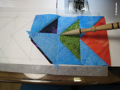 Als je het lapje voor de achtergrond klaar legt, komt hij precies goed uit als het een naadtoeslagje over de vorige naad heen ligt en met het hoekje op de schuine naad daarboven.
