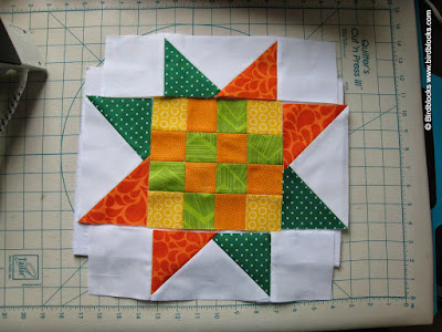 Het eerste blok is geplaatst, en je kunt ook de bonusblokken al zien zitten. Let er bij het stofgebruik op dat je op tijd voldoende (lengte) stof overhoudt om deze randblokken te kunnen maken. De langste strookjes in deze blokken zijn immers 30 cm (afgewerkte maat), dus zorg dat je dat op tijd reserveert.