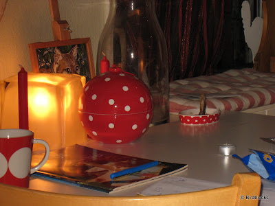 Tweede kerstdag heb ik met mijn lief, ouders en broer en schoonzus bij mij thuis gevierd. Geen cadeaus hadden we afgesproken, maar ja voor de gastvrouw (ik dus) was toch iets meegenomen. Van mijn moeder kreeg ik een dienblad vol kaarsen en van mijn schoonzus deze geweldige... tsja wat is het, eerst dacht ik dat het een enorme kerstbal was, maar het is een koekjespot, die helemaal volgestopt is met spekkies. Jummie! Leuk hè, zien jullie het thema, bij mij thuis, servies in rood met witte stippen (of andersom), ach ja, je zal maar van rood houden :-)