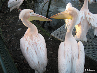 ...inderdaad pelicanen. We zijn vandaag in Artis geweest. Op deze foto werden ze net gevoederd en kwamen ze heel dichtbij, die snavels zijn echt indrukwekkend, al gauw zo'n 30-35 cm lang. Het zijn echt grote vogels, ze waren ongeveer even hoog als het hekje, al gauw 70-80 cm en dan slaan ze ook nog wel eens hun vleugels uit (waar de vliegpennen uit zijn gehaald).