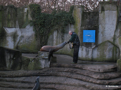 Toen kwamen we uit bij de zeeleeuwen...(We zijn maar niet naar binnen gegaan bij de vlinders, wat dat leek ons een beetje te groot temperatuurverschil, geen zin in loopneuzen.) Bij de zeeleeuwen kwamen we precies op tijd aan voor de voedershow. Want dat was het een heuse show. En niet, zoals de verzorger ons vertelde omdat er zo nodig een show moet worden opgevoerd, maar meer omdat ze op een speelse manier aan gedragsverrijking doen en ondertussen allerlei oefeningen om de dieren te laten wennen aan medische onderzoeken: een methode om oogdruppels toe te dienen, een narcosemaskertje op hun neus drukken, een echo maken of hun identiteitschip af te lezen, zonder dat de dieren daarvoor dus op een gevaarlijke manier moeten worden verdoofd. Maar al dat nuttigs ziet er erg leuk uit, een zeeleeuw op schoot is erg schattig, maar dus ook handig om de dierenarts de mogelijkheid te geven om de achterkant of onderkant van het dier te laten onderzoeken. Ik heb de opslagcapaciteit van de camera volgeschoten met foto's en filmpjes, mijn lief was helemaal verbaasd dat dat kon (2 GB), nou laat mij maar struinen.