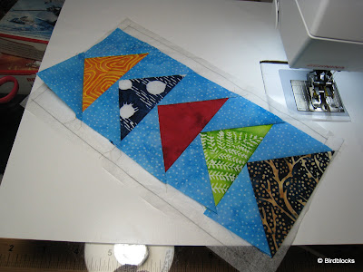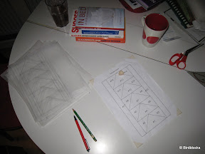 De afmetingen van deze gequilte lap zijn: hoogste punt 46 cm, hoogte van de zijden 29 cm, lengte van de onderzijde 58 cm (2x29 cm). (de foto is niet helemaal in verhouding) Zo is het gequilt:
